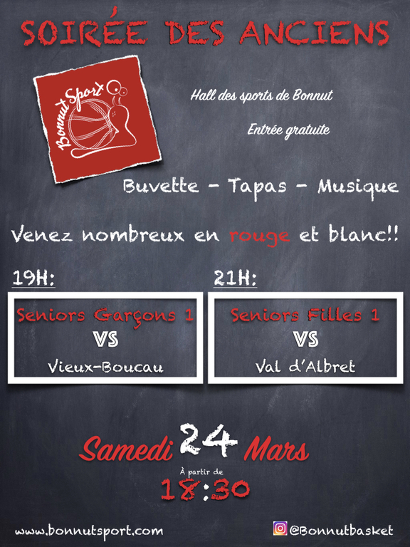 Vous êtes convié(e)s a partir de 18h30 a la maison Tilh, les séniors garçons reçoivent Vieux Boucau a 19h et les filles enchainent a 21h contre Val d'Albret..En plus de tout ce sport, buvette/tapas et musique rythmeront la soirée en souvenir des Martinades pour les plus anciens et des Bugades de la maison Tilh pour les moins anciens..